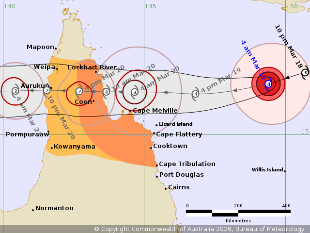 “As the cyclone crosses the coast, we could see peak, very destructive wind gusts in excess of 230km/h close to the core of the system, with broader areas of destructive gusts up to 160km/h an hour between Lockhart River and Cooktown,” Christie Johnson from the Bureau said.
