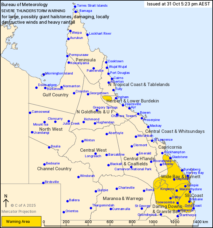 “Severe thunderstorms are likely to produce large hailstones, damaging winds and heavy rainfall that may lead to flash flooding over the next several hours in the Wide Bay and Burnett, Southeast Coast and parts of the Central Highlands and Coalfields, Capricornia, Darling Downs and Granite Belt and Maranoa and Warrego districts. Locations which may be affected include Toowoomba, Brisbane, Dalby, Maroochydore, Gympie, Gladstone, Ipswich, Kingaroy, Cleveland, Gatton, Jimboomba and Caboolture.”