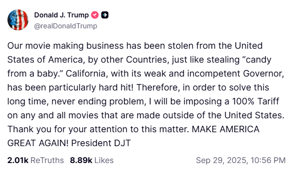 The US President has revealed he will impose a “100% tariff on any and all movies that are made outside of the US”.