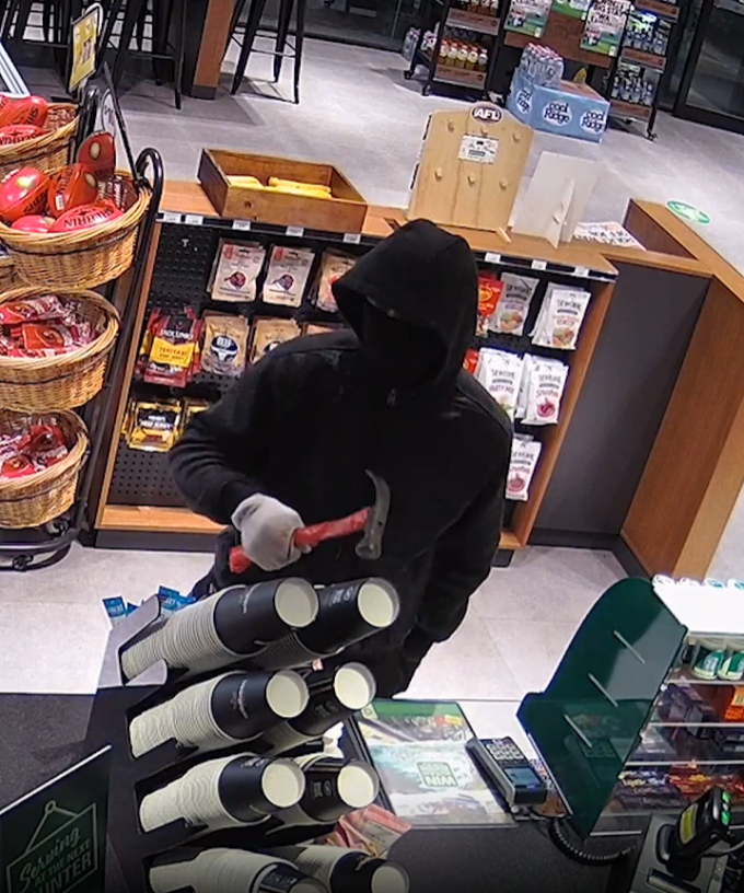 CCTV has been released of two men wearing black hoodies and face masks entering the service station along Nexus Drive around 4.20am on October 8.