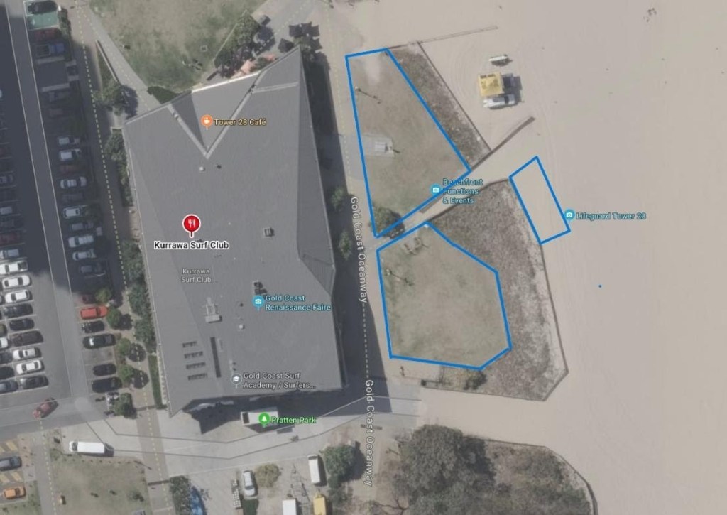 The proposed beachside dining area for Kurrawa would take in a grassed section at the front of the surf club and a small section of sand, while the Surfers Paradise proposal would see a small section of the sand taken up opposite the surf club.