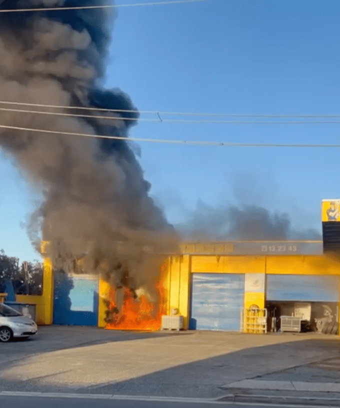 A major emergency situation has been declared in Burleigh Heads after a fierce fire tore through a tyre shop, sending thick plumes of smoke billowing across the suburb.