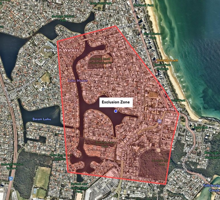 The restricted area stretches from Burleigh Street to the north across to West Burleigh Road to West Street, Tabilban Street and across to Dunlin Drive up to Christine Avenue.