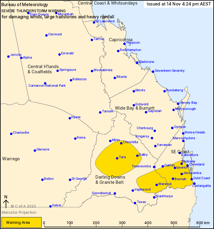 “Severe thunderstorms are likely to produce damaging winds, large hailstones and heavy rainfall that may lead to flash flooding in the warning area over the next several hours. Locations which may be affected include Warwick, Gold Coast, Brisbane, Dalby, Ipswich, Cleveland, Jimboomba and Coolangatta.”