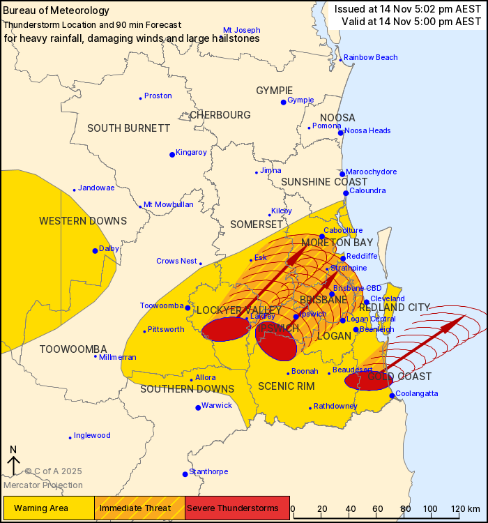 “These thunderstorms are moving towards the northeast. They are forecast to affect Ipswich, Laidley and Gatton by 5:45 pm and Brisbane CBD, Strathpine and Caboolture by 6:30 pm.”