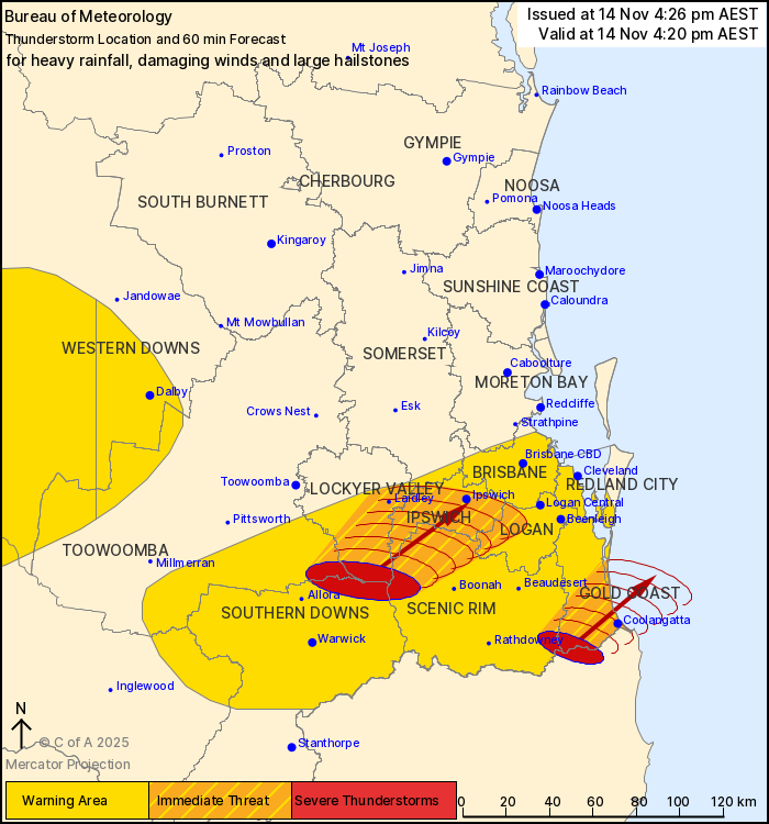 EARLIER | At 4.20pm, the Bureau of Meteorology issued a warning for Logan, Scenic Rim, Southern Downs, Toowoomba, Lockyer Valley, Gold Coast and Somerset Council Areas.