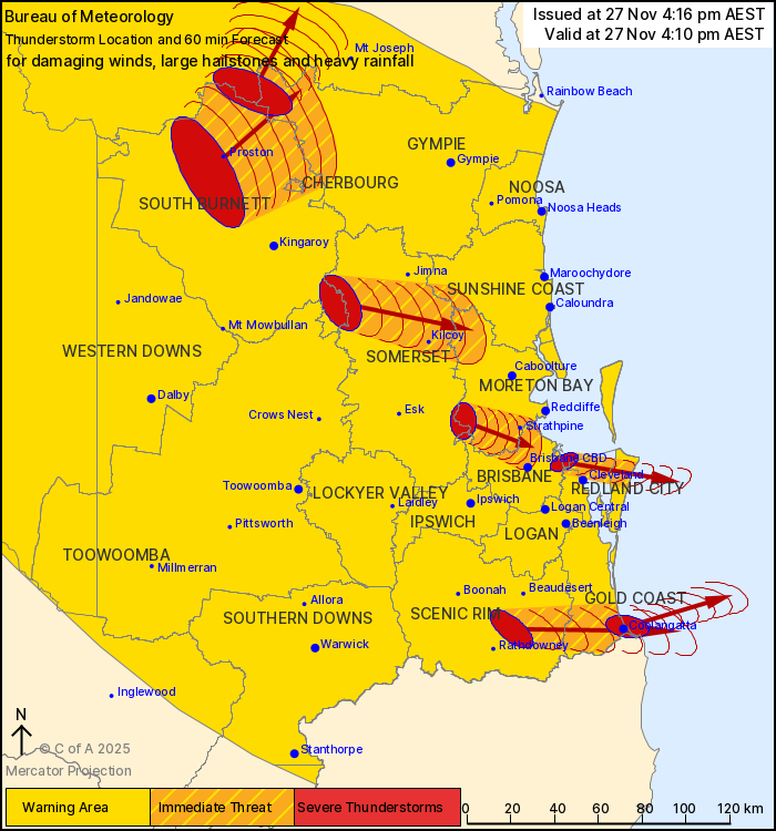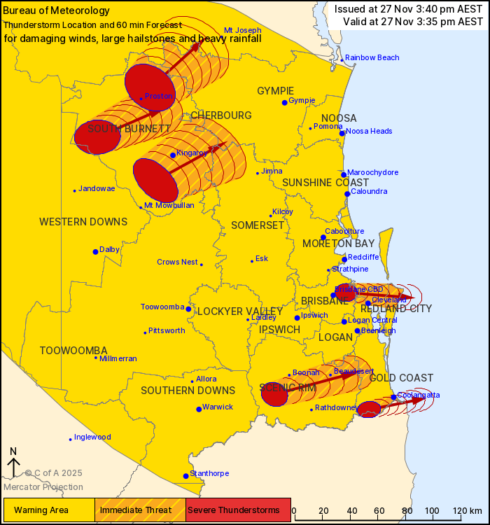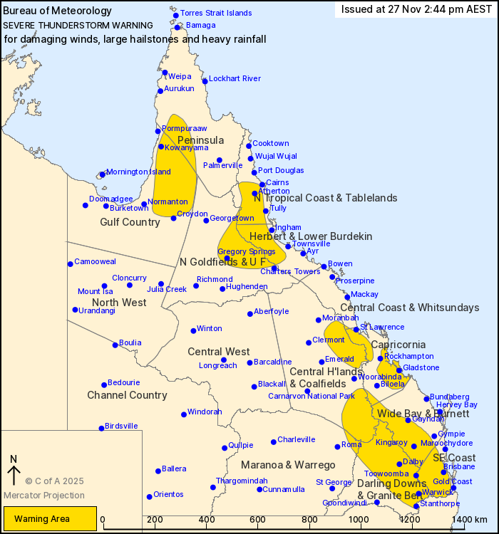 “Severe thunderstorms are likely to produce damaging winds, large hailstones and heavy rainfall that may lead to flash flooding over the next several hours in the Southeast Coast and parts of the Central Highlands and Coalfields, Capricornia, Wide Bay and Burnett, Maranoa and Warrego and Darling Downs and Granite Belt districts. Locations which may be affected include Warwick, Gold Coast, Toowoomba, Brisbane, Dalby, Maroochydore, Gympie, Kingaroy, Stanthorpe, Coolangatta and Ipswich.”