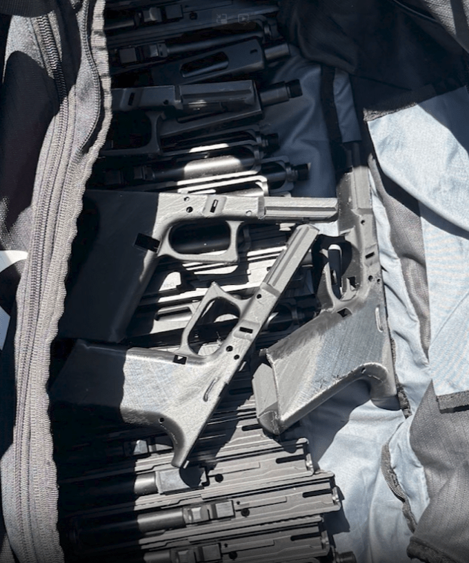 Officers further searched the plastic container, uncovering 34 3D-printed Glock-style handguns, along with 800 rounds of 9mm ammunition, a quantity of handgun magazines, a quantity of rifle magazines, and a quantity of plastic rifle trigger guard assemblies.