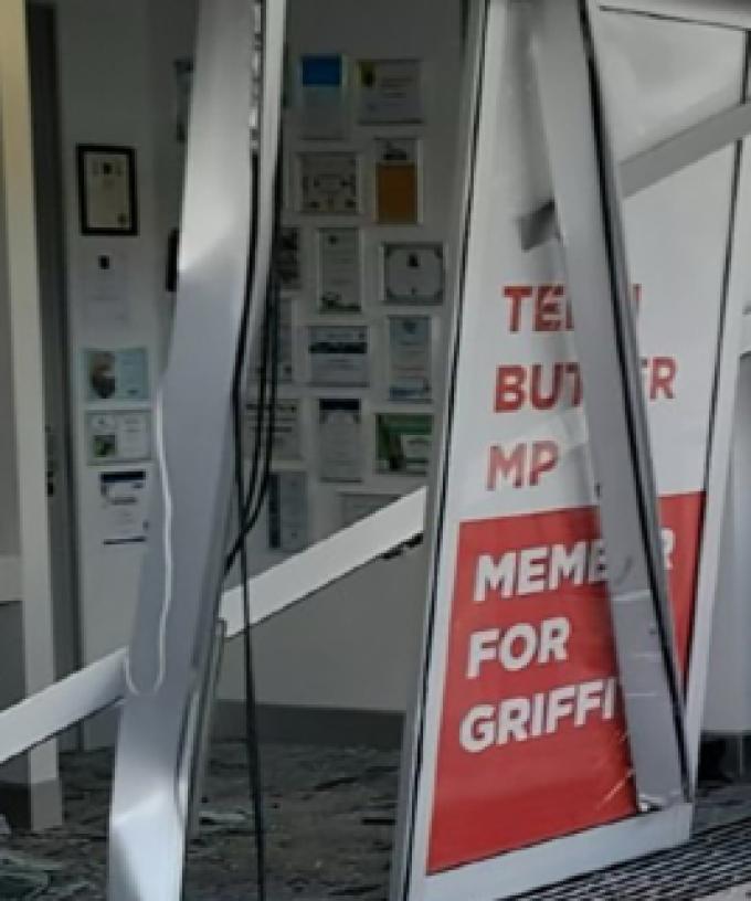 Photos sent to AAP by a witness show broken door frames and shattered glass on the carpet inside the office.