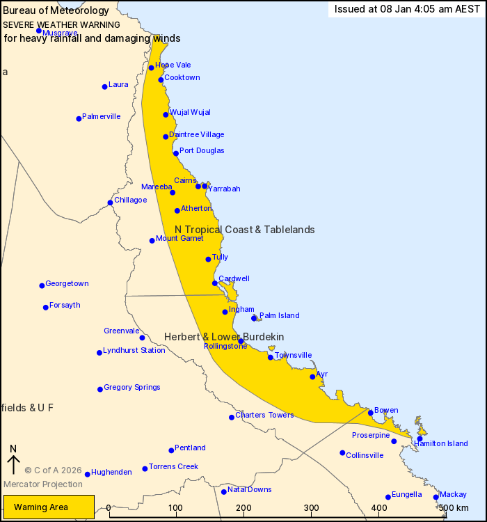 Locations which may be affected include Cairns, Yarrabah, Wujal Wujal, Port Douglas, Hope Vale, Atherton, Mareeba, Palm Island, Cardwell, Ingham, Ayr, Townsville, Bowen, Airlie Beach and the Whitsunday Islands.